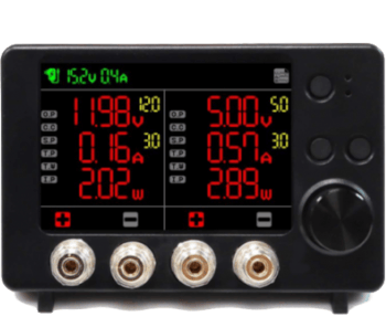 The SmartPower 3 meter measures the voltage, current, and power of the devices connected to any of the two output channels. The DC input (charger) and USB data link ports are located on the opposite sides.