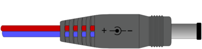 The DC plug powers the SUT. Make sure that you connect the color coded wires correctly to the power meter. Usually the plus wire / banana connector is encoded with red color and the minus with blue or black color. Reversing the wires may destroy the SUT (unless it has reverse polarity protection) and even start a fire!