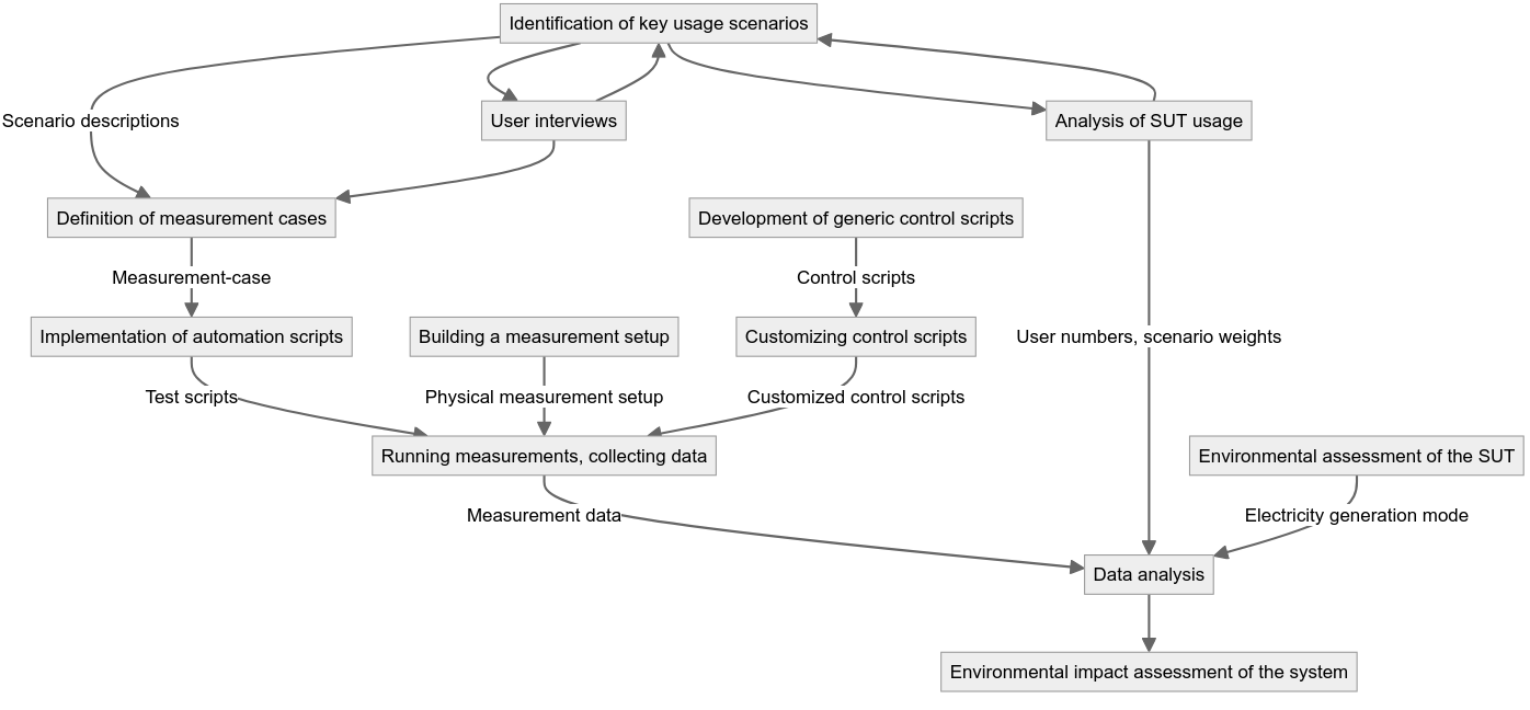 The simple process of power measurement includes the definition of measurement cases from the system usage scenarios, measurement scheduling and the construction of the associated scripts and the execution of the measurements. The resulting measurement data is analysed and, if necessary, used to identify new usage scenarios. The process is described below:
