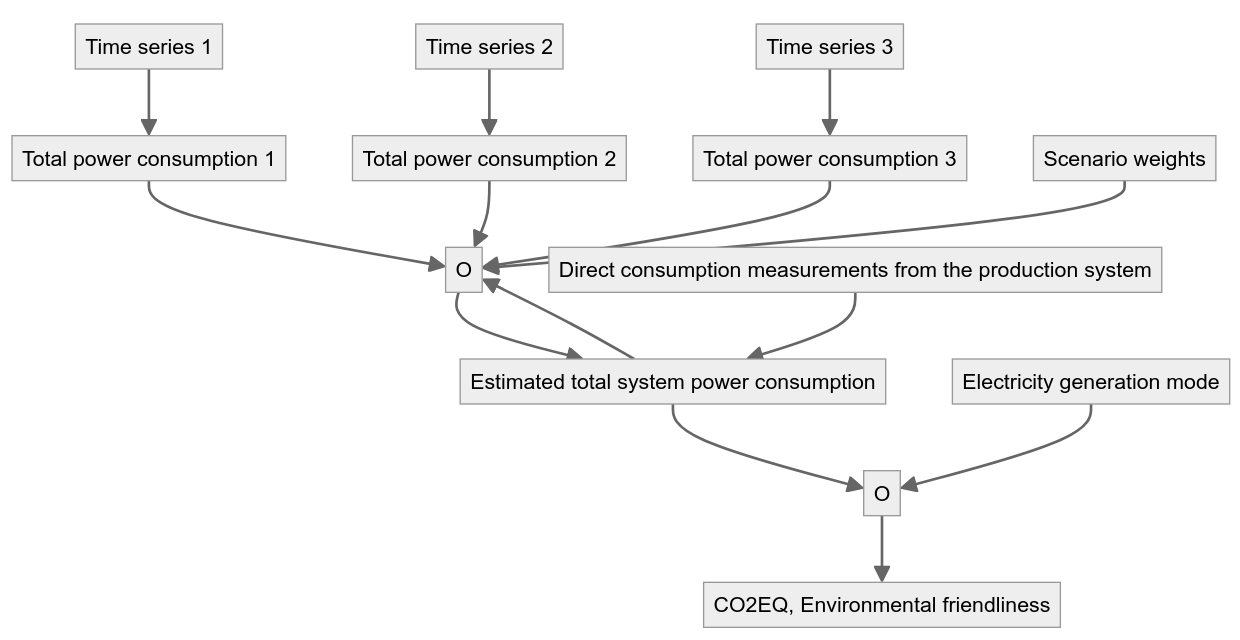 The time series of the different measurements together with the weights of the measurements can be used together with the consumption measurements of the generation system to generate an estimate of the total power consumption of the system. Taking into account the electricity generation mode, an assessment of the environmental performance and CO2 equivalence of the software can be made.