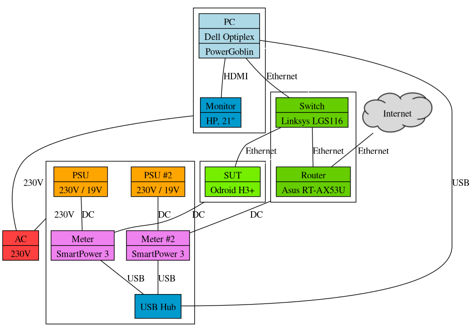In this setup, the meters are also connected to the PC via a USB hub. This is because in our lab setup there are more connected meters than free USB ports in the host PC. A similar rationale is behind the addition of the switch -- the router we use only has five ports and there are more network connected devices in the laboratory. The router also provides a firewall and access to internet and connects the SUT and the PC running PowerGoblin for easier coordination of the measurements.